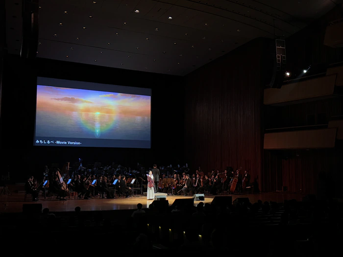 劇場版の劇伴メドレーの演奏で、時はさらに進みます。登壇した茅原実里さんが歌声を響かせると、夕日が射し込むように映像が流れ出します。滑らかにオーケストラの演奏が加わり、壮大な『みちしるべ ~Movie Version~』が届けられました。涙をぬぐう客席からは、歓声とともに盛大な拍手がわきました。